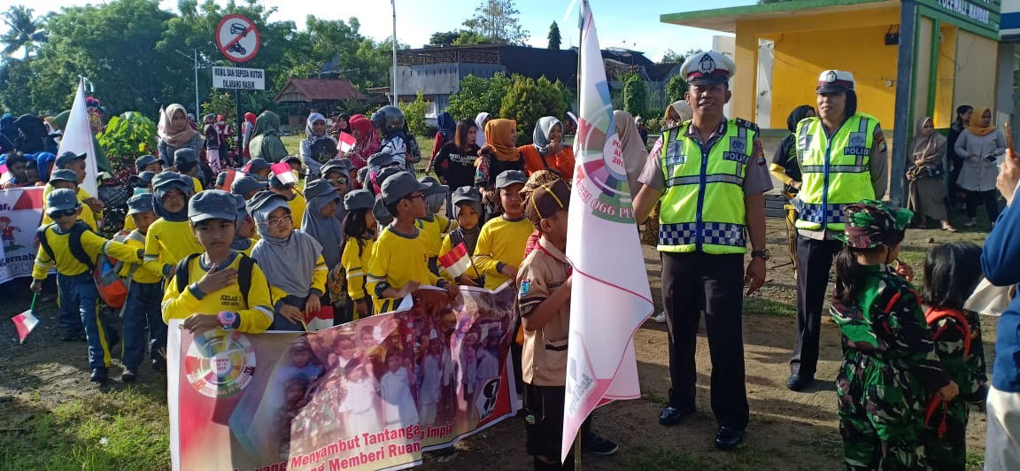 Kanit Dikyasa Satlantas Polres Polman, AIPTU Rahman, S.Sos, M.Si photo bersama murid SDN 066 Pekkabata, sebelum pawai dimulai. Sumber Photo : Polres Polman