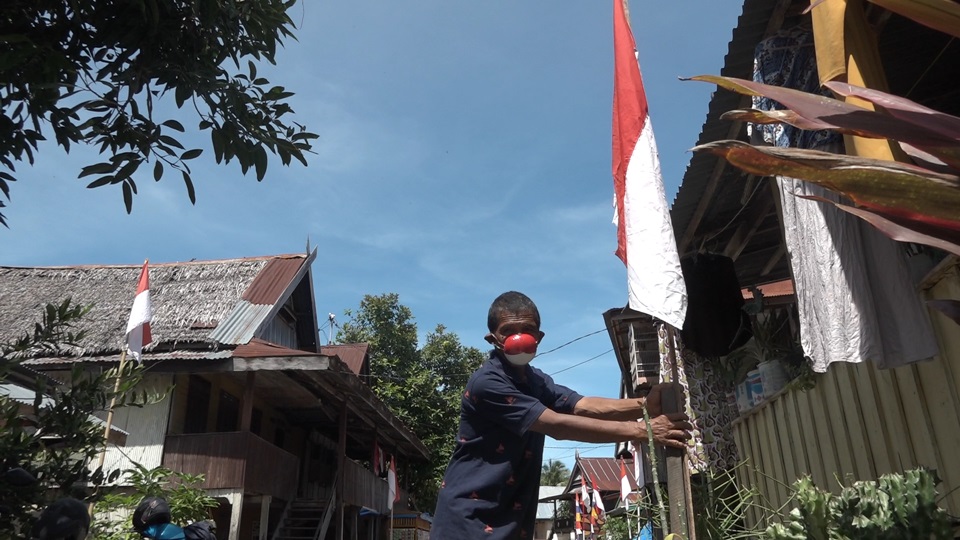 “ Karena waktu itu sudah mendapatkan masker, akhirnya saya berinisiatif untuk buat sendiri. Saca cari gergaji, cari tempurung (batok) kelapa, kemudian saya bentuk menyerupai masker, “ ujar Rahman, sembari mencontohkan cara membuat masker yang dipakainya.